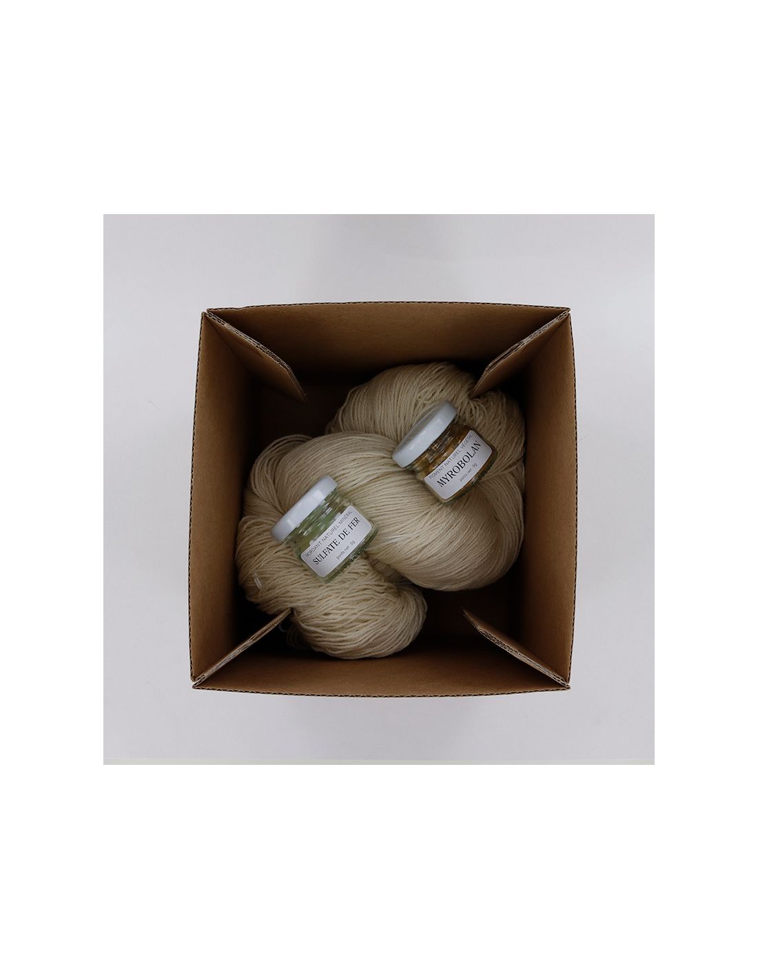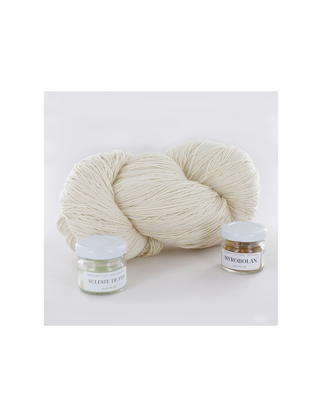 - un écheveau de 250g de fil BB Nat , composé à 100% de laine mérinos, non teint, non traitée. Cette quantité est suffisante pour réaliser un ouvrage tricoté tel qu’une grande écharpe, ou un pull pour enfant. Elle est également suffisamment réduite pour pouvoir être teinte en un seul bain, avec des moyens non industriels
