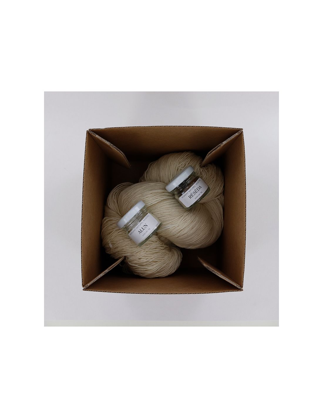 - un écheveau de 250g de fil BB Nat , composé à 100% de laine mérinos, non teint, non traitée. Cette quantité est suffisante pour réaliser un ouvrage tricoté tel qu’une grande écharpe, ou un pull pour enfant. Elle est également suffisamment réduite pour pouvoir être teinte en un seul bain, avec des moyens non industriels