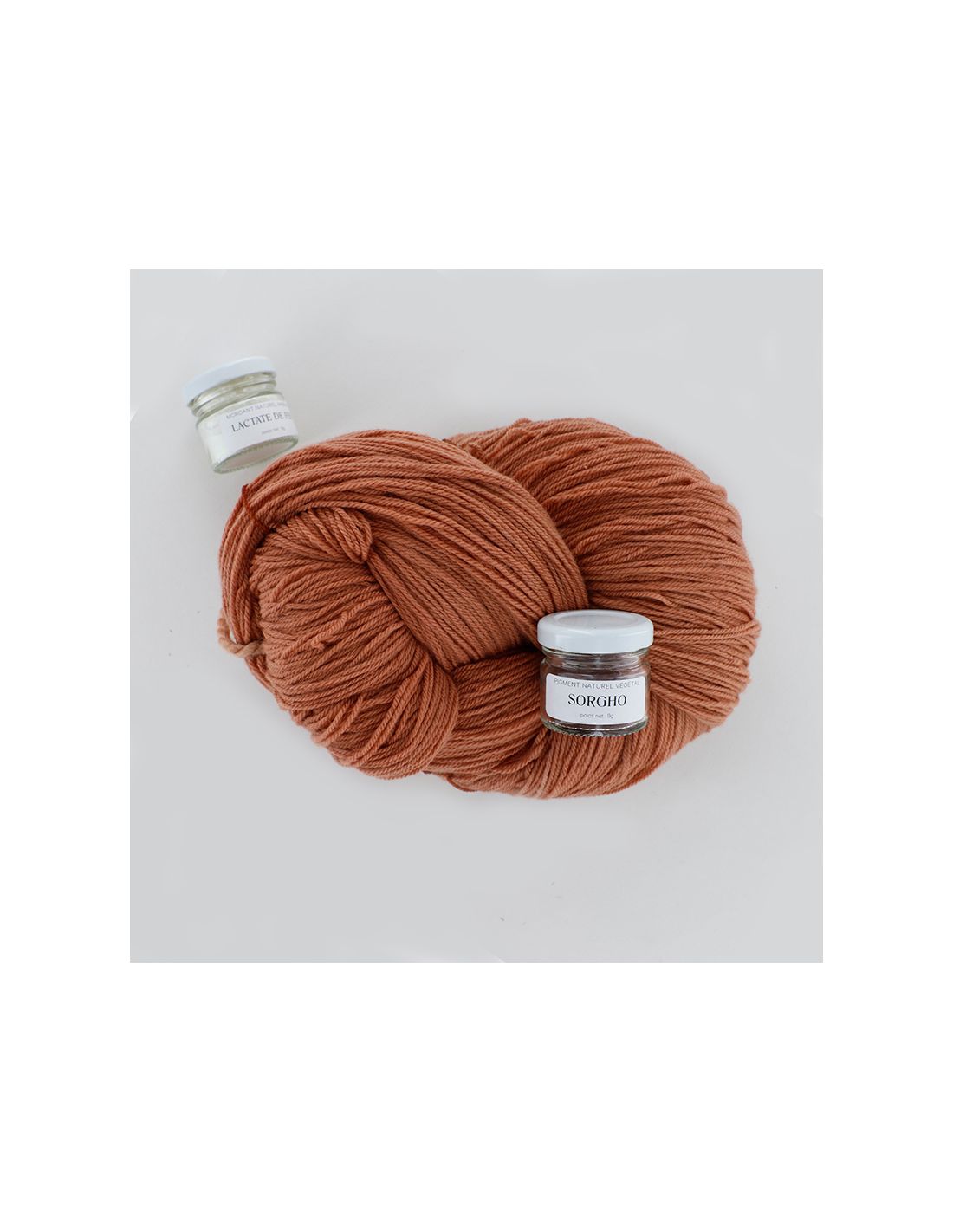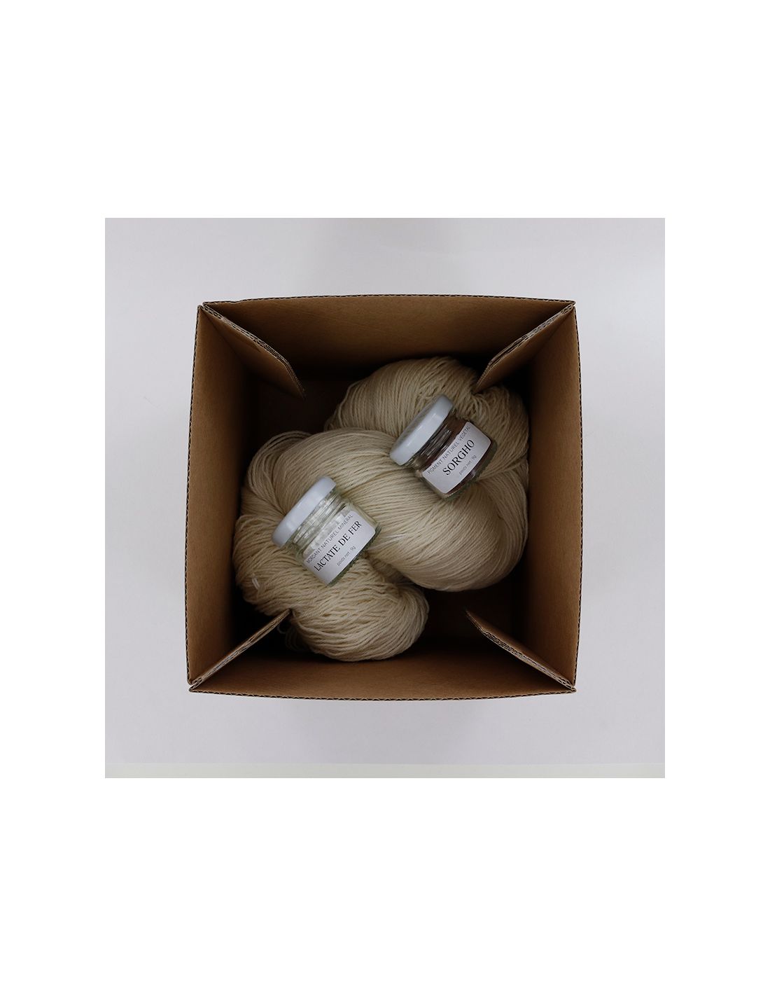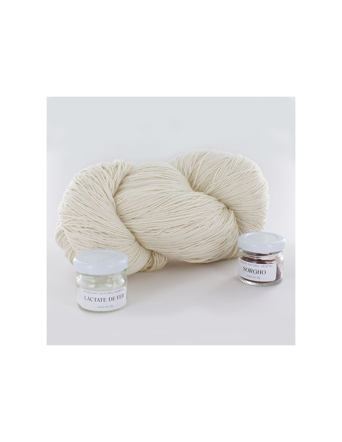 - un écheveau de 250g de fil BB Nat , composé à 100% de laine mérinos, non teint, non traitée. Cette quantité est suffisante pour réaliser un ouvrage tricoté tel qu’une grande écharpe, ou un pull pour enfant. Elle est également suffisamment réduite pour pouvoir être teinte en un seul bain, avec des moyens non industriels