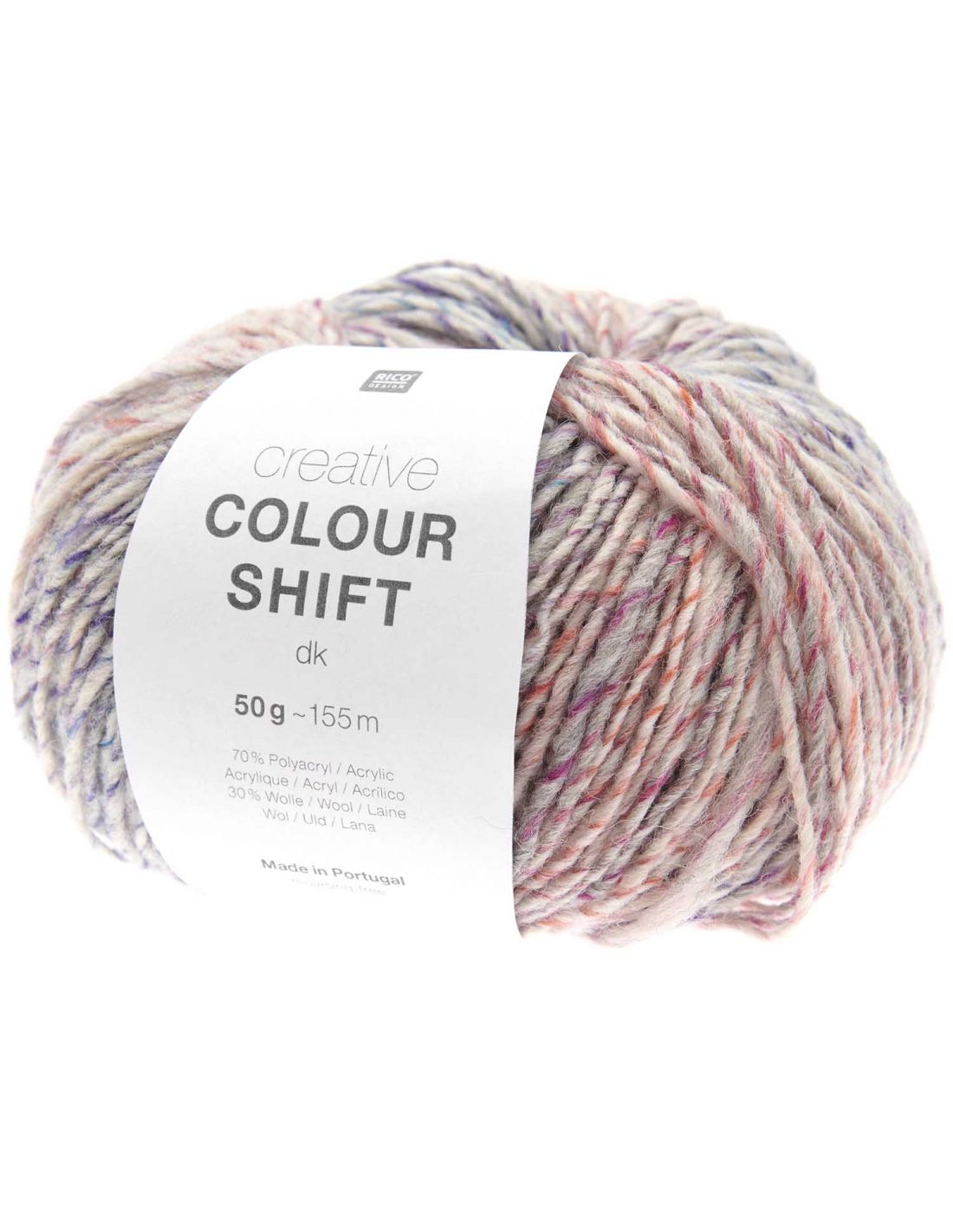 Pour la gamme Creative Colour Shift, les 2 fils avec des dégradés de couleurs différents sont torsadés l'un dans l'autre et donnent au fil son aspect torsadé caractéristique. Les pièces tricotées n'ont pas un imprimé rayé classique, mais fusionnent des zones colorées qui se déplacent naturellement en fonction de la largeur de la pièce tricotée.