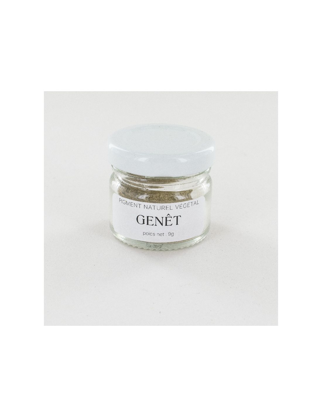 Pot de 9g d'extrait de Genêt, un pigment naturel extrait de la plante du même nom.