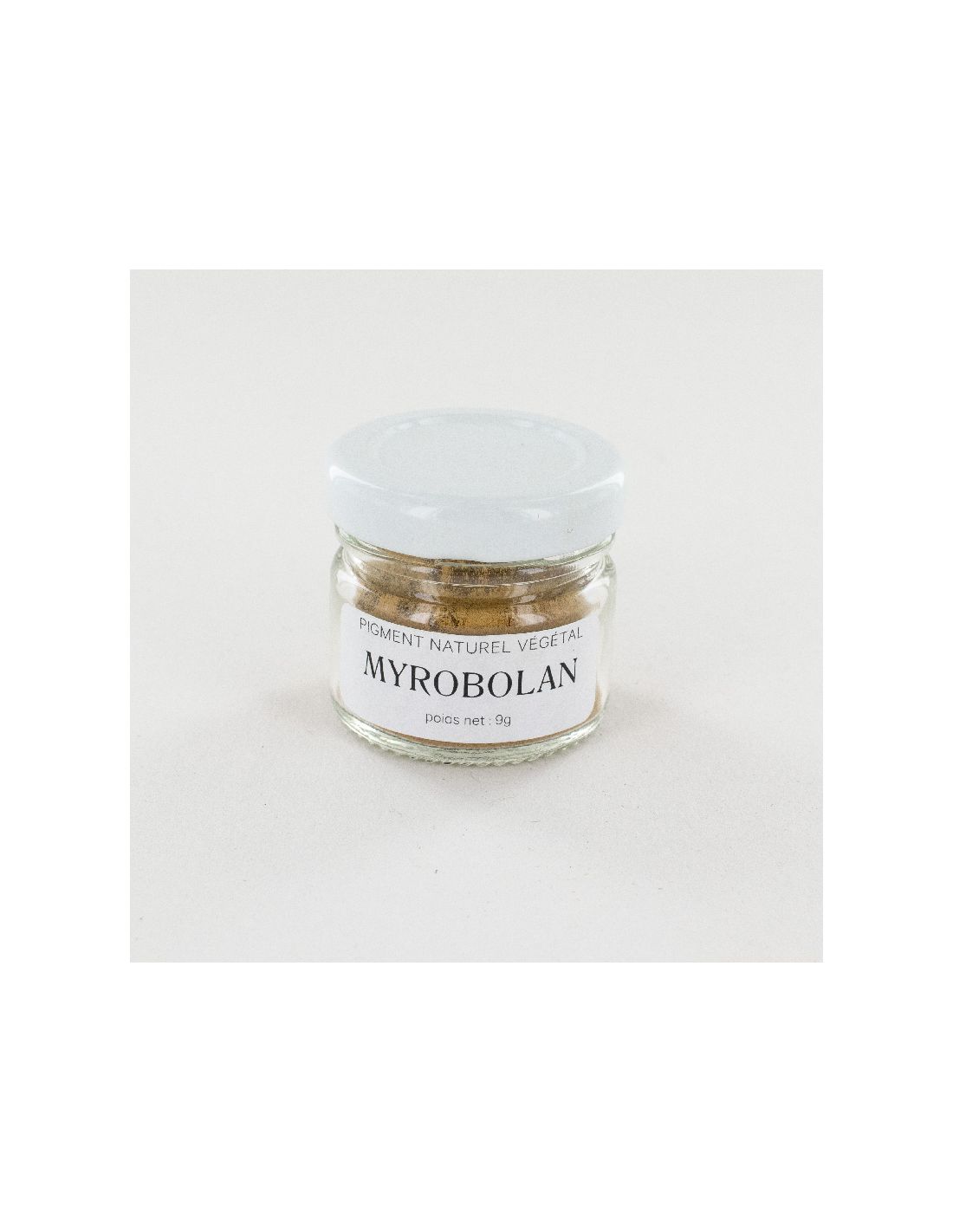 Pot de 9g d'extrait de Myrobolan, un pigment naturel extrait de la plante du même nom.
