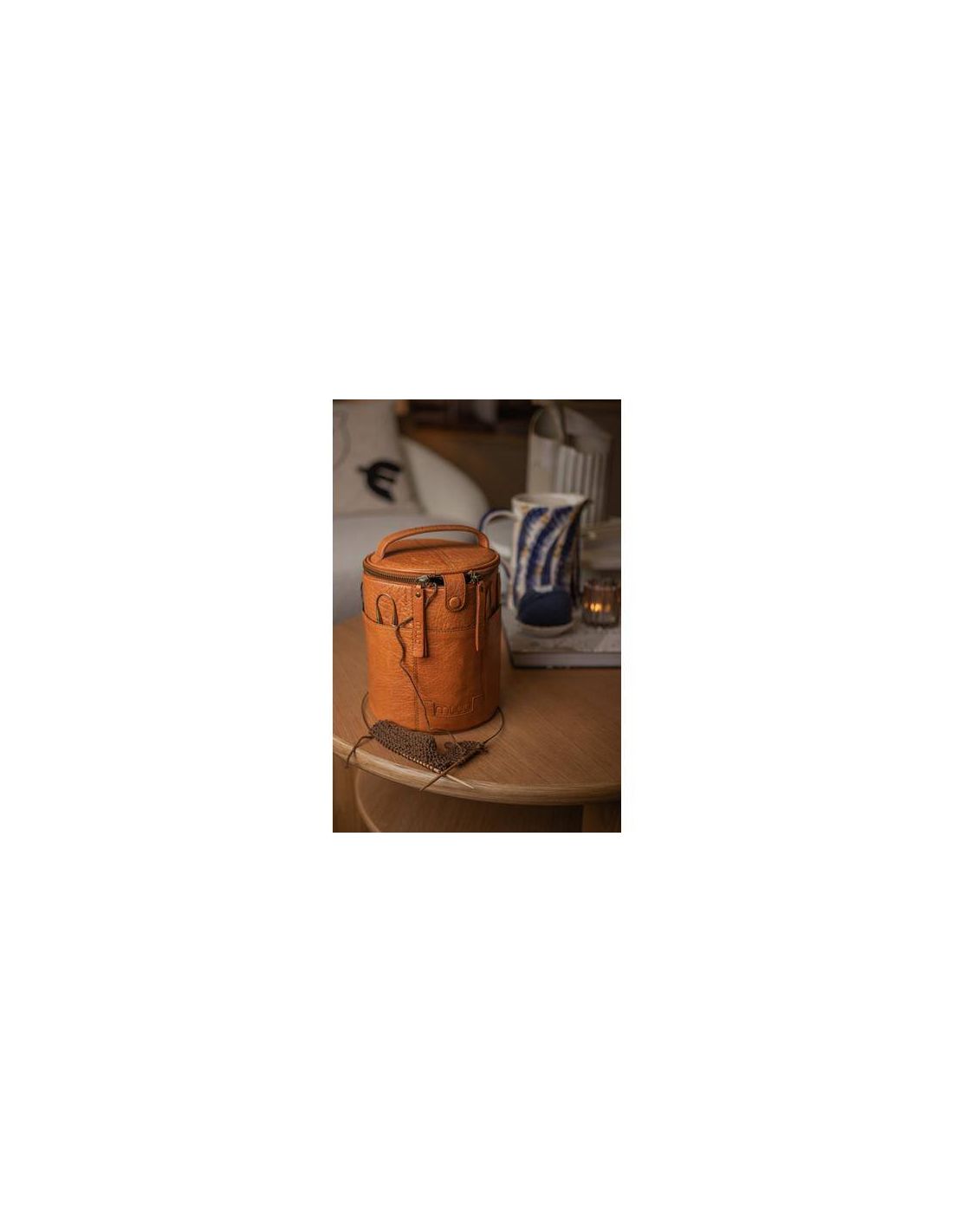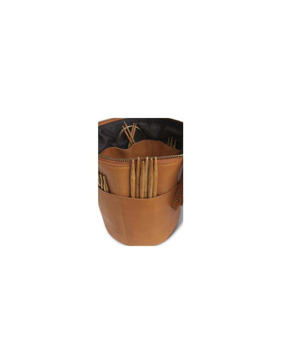 Saturn de muud est un sac en cuir élégant, fabriqué à la main, pour ranger et transporter parfaitement vos projets de tricot et de crochet.